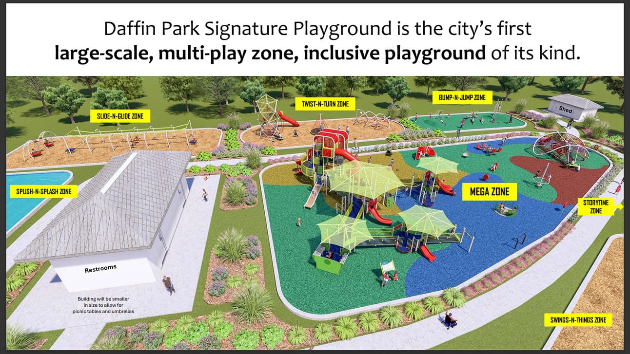 Scheduled for completion in 2025, the playground will span several “zones” offering a wide variety of play experiences, including dual ziplines, saucer swings, a twist tower, a splash pad, and even a “mega zone” featuring inclusive climbing units. Designed to accommodate everyone, the park will include ADA-compliant play sets, surfaces, and adult changing stations in public restrooms, ensuring it’s a place where all kids can enjoy the fun.