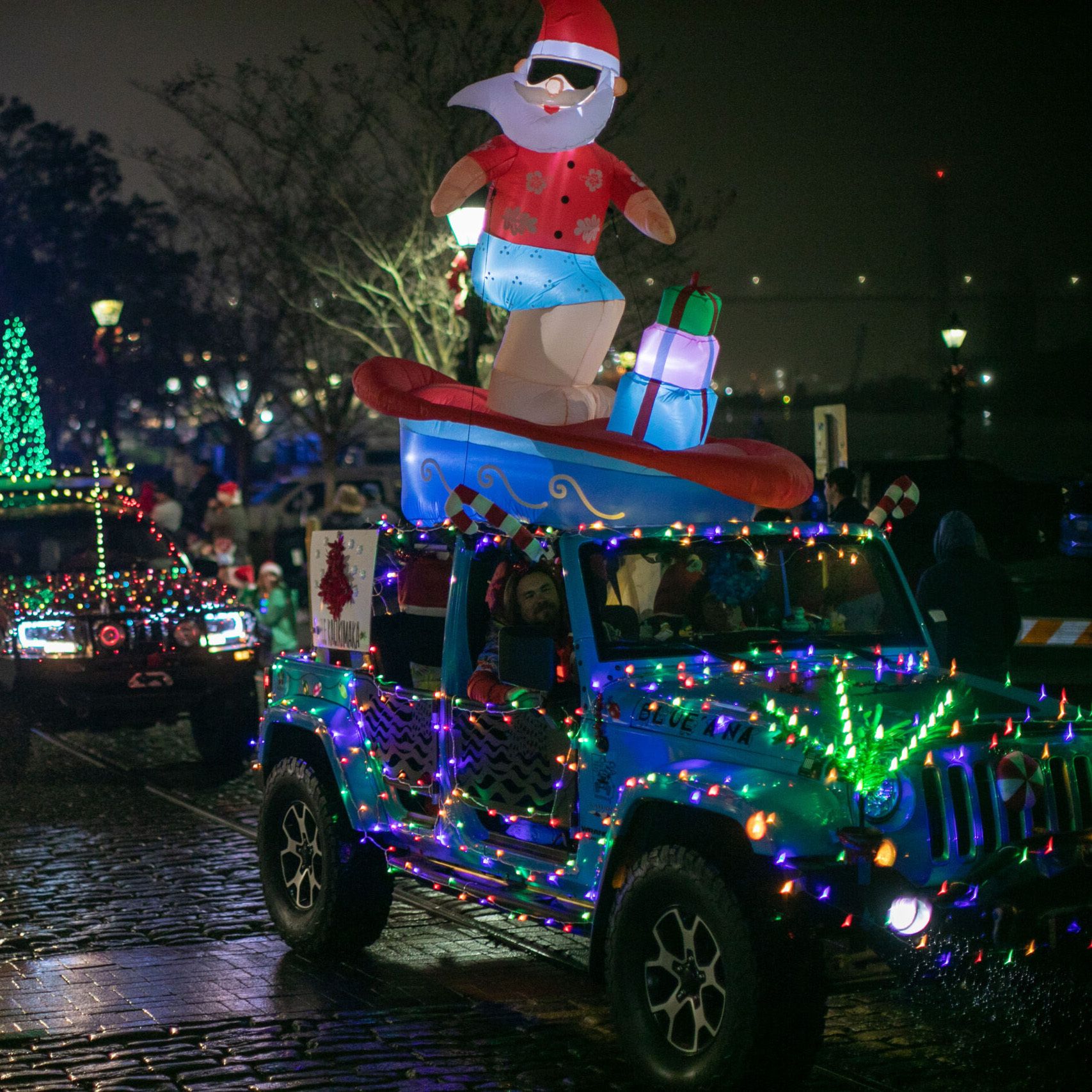 A cheerful neighborhood Christmas parade filled with music, characters, and Santa himself.